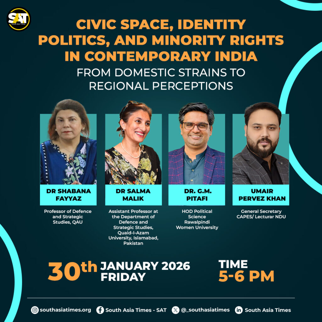 Civic Space, Identity Politics, and Minority Rights in Contemporary India: From Domestic Strains to Regional Perceptions Janurary 30, 2026 Online Ms. Dilawaiz Tabessum Share 20 Janurary 2025 Friday Roundtable Event South Asia Times Inqueries: info@southasiatimes.org Key Participants: Dr. Shabana Fayyaz Dr. Salma Malik Dr. G. M. Pitafi Mr. Usama Khan Background and Context: India’s political […]