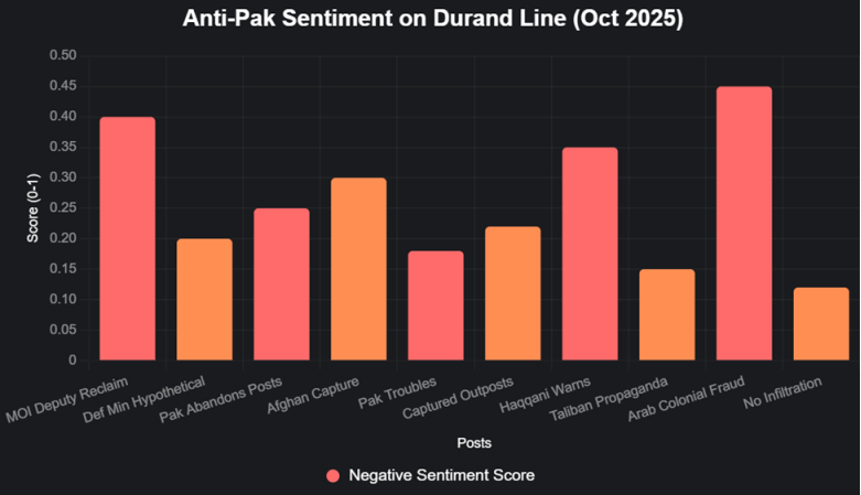 Correspondingly, at the heart of this propaganda war lies a line drawn more than a century ago, the Durand Line. Once a colonial demarcation separating British India from Afghanistan, has evolved into a potent political symbol. In October 2025, social media conversations around the Durand Line surged alongside the clashes. Sentiment analysis revealed a sharp rise in anti-Pakistan rhetoric, particularly posts using phrases like “Colonial Fraud” and “Reclaim Land” to frame Pakistan as a colonial impostor or occupying power. By contrast, posts focused on factual military updates or ceasefire developments showed lower negativity. The data exposes a clear pattern: emotional, identity-driven narratives provoke greater hostility than factual reporting. The Taliban and their online networks exploit this dynamic, reviving old colonial grievances to frame Pakistan as an illegitimate successor of British imperialism.